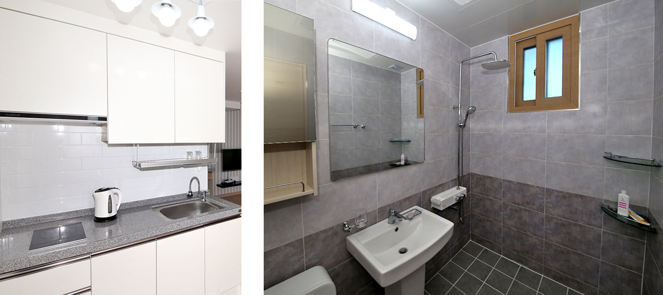 침대, TV, 화장대, 시스템 에어컨, 빨래건조기, 이불, 행거, 식탁, 싱크대, 냉장고, 전기밥솥, 전자레인지, 커피포트, 쿡탑, 4인용 밥상, 헤어드라이기, 수건, 샴푸, 휴지, 비누, 치약