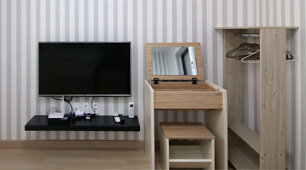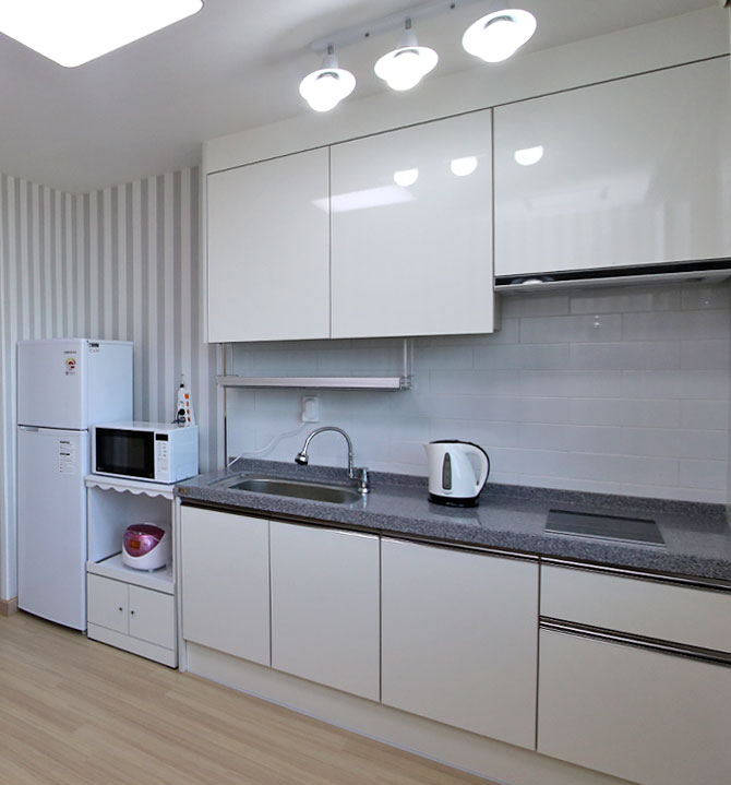 TV, 화장대, 시스템 에어컨, 빨래건조기, 이불, 행거, 싱크대, 냉장고, 전기밥솥, 전자레인지, 커피포트, 쿡탑, 4인용 밥상, 헤어드라이기, 수건, 샴푸, 휴지, 비누, 치약